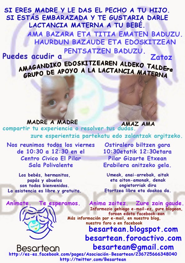 Besartean es una organización sin ánimo de lucro, localizada en Vitoria-Gasteiz, cuyos objetivos pasan por crear una red de familias interesadas en los procesos de embarazo, parto, posparto, lactancia y crianza, vividos de manera consciente y respetuosa. En relación con la lactancia tratamos de promover, normalizar y apoyar.